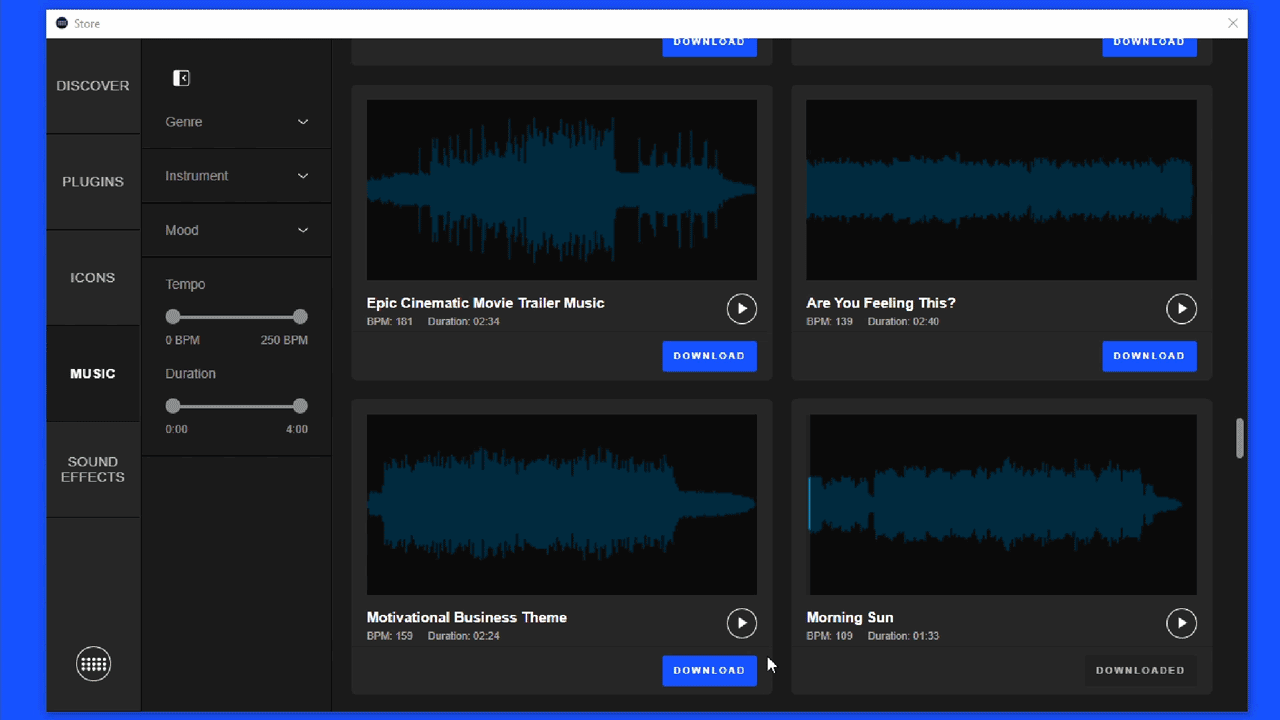 Click the play button to preview a track. If you want it, simply download and add it to your sound Board action.